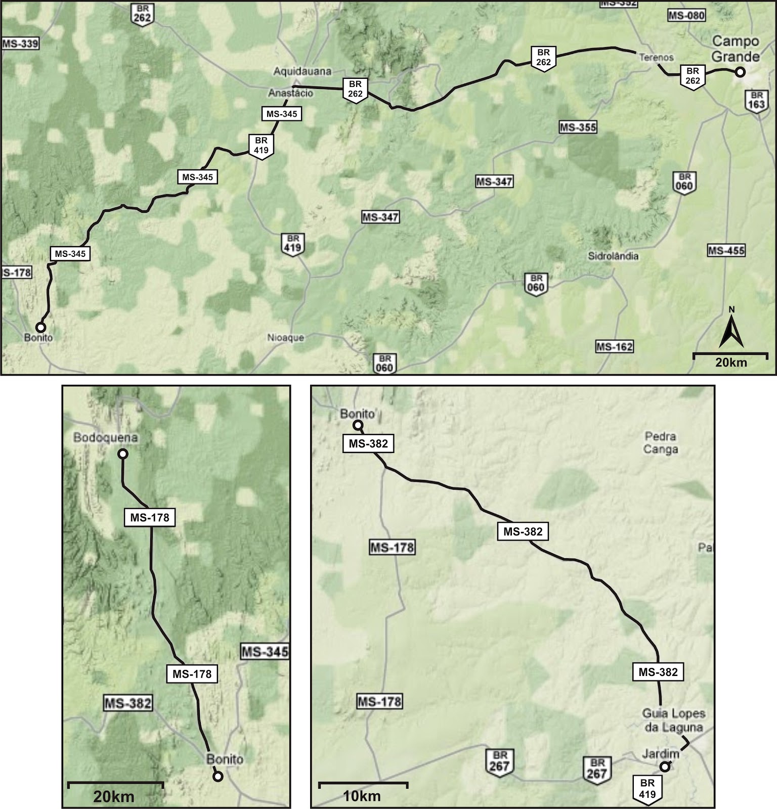 A distância de Campo Grande a Bonito é de 297,2 km, via BR-060. O percurso leva 3 horas e 35 minutos para ser realizado, aproximadamente e dependendo do trânsito na região. As opções para se deslocar entre Campo Grande a Bonito são diversas, mas o trajeto de carro ainda é mais vantajoso pelo conforto e economia, sem contar que você.