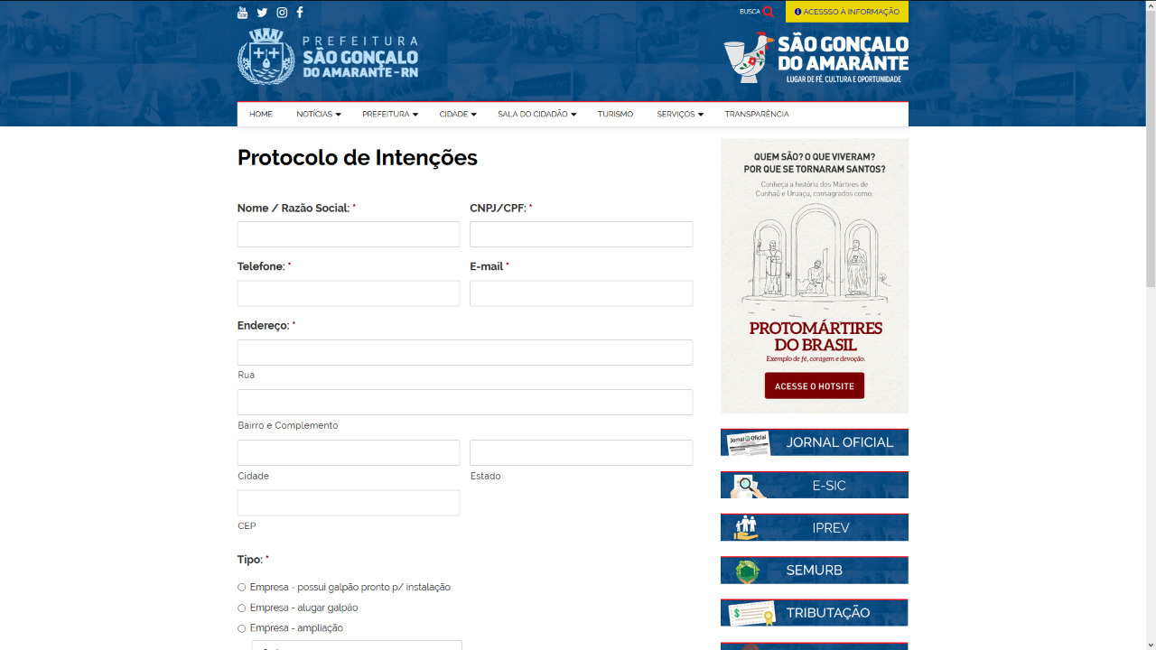 São Gonçalo do Amarante/RN CEP 59291-625 (84) 99621-7337. gabinetecivil@saogoncalo.rn.gov.br. NOME EMPRESARIAL: MUNICIPIO DE SAO GONCALO DO AMARANTE. CNPJ: 08.079.402/0001-35.. 1° PASSO: Acesse a página da Prefeitura Municipal de São Gonçalo do Amarante