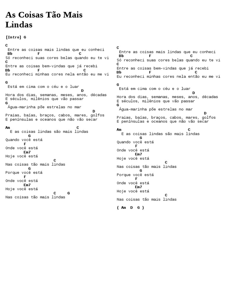 Acordes, Letra y Tablatura de la canción As Coisas Tão Mais Lindas de Nando Reis (Nando Reis As Coisas T o Mais Lindas). ¿Cómo tocar As Coisas Tão Mais Lindas en la guitarra?.. LETRA DE LA CANCIÓN: Ver la letra sola (sin acordes) OTRAS VERSIONES DE LA MISMA CANCIÓN: Ver. 2 Ver. 3 Ver. 4 Ver. 5 Ver. 6. DESCARGAR PDF / IMPRIMIR CANCIÓN.