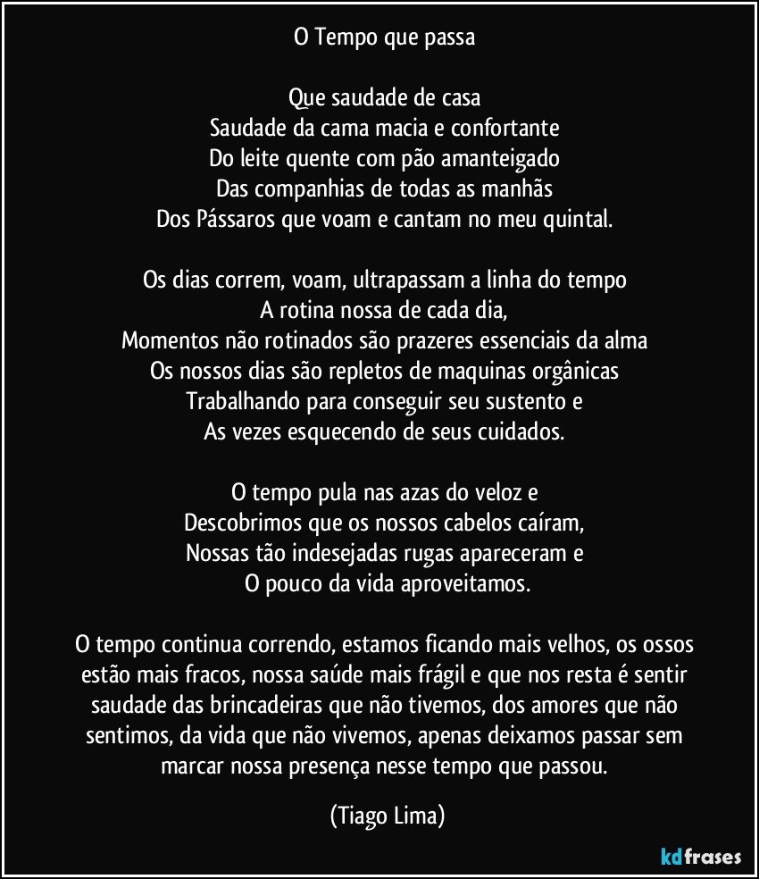 O Tempo que passa Que saudade de casa Saudade da cama macia e...