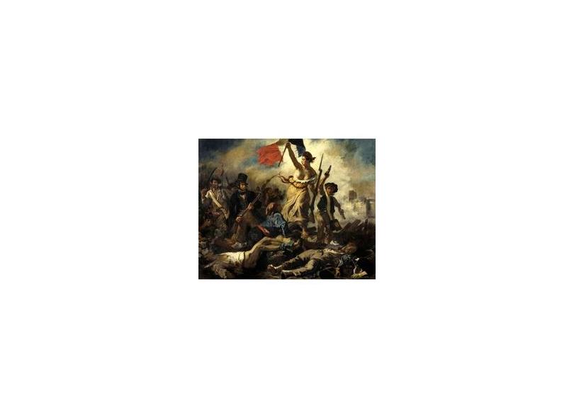 Eugène Delacroix, A Liberdade Guiando o Povo, 1830. A Imagem se tornou o símbolo da França e da Revolução Francesa, ainda que pintada em relação à revolução de 1830 e não como referência à queda da Bastilha em 1789. Foi reproduzida no dinheiro francês que precedeu o Euro, inspirou o logo da Air France, serviu de fundo para selos.