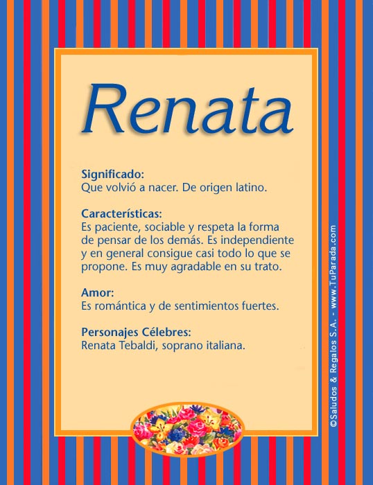 Significado del nombre Renata. Descubre el significado de Renata, su origen y sus características. Tarjeta con imagen de Renata en colores y en tamaño grande. El nombre Renata para imprimir y regalar. ¡Comparte el nombre con familiares y amigos! Renata. Significado: Que volvió a nacer. De origen latino.